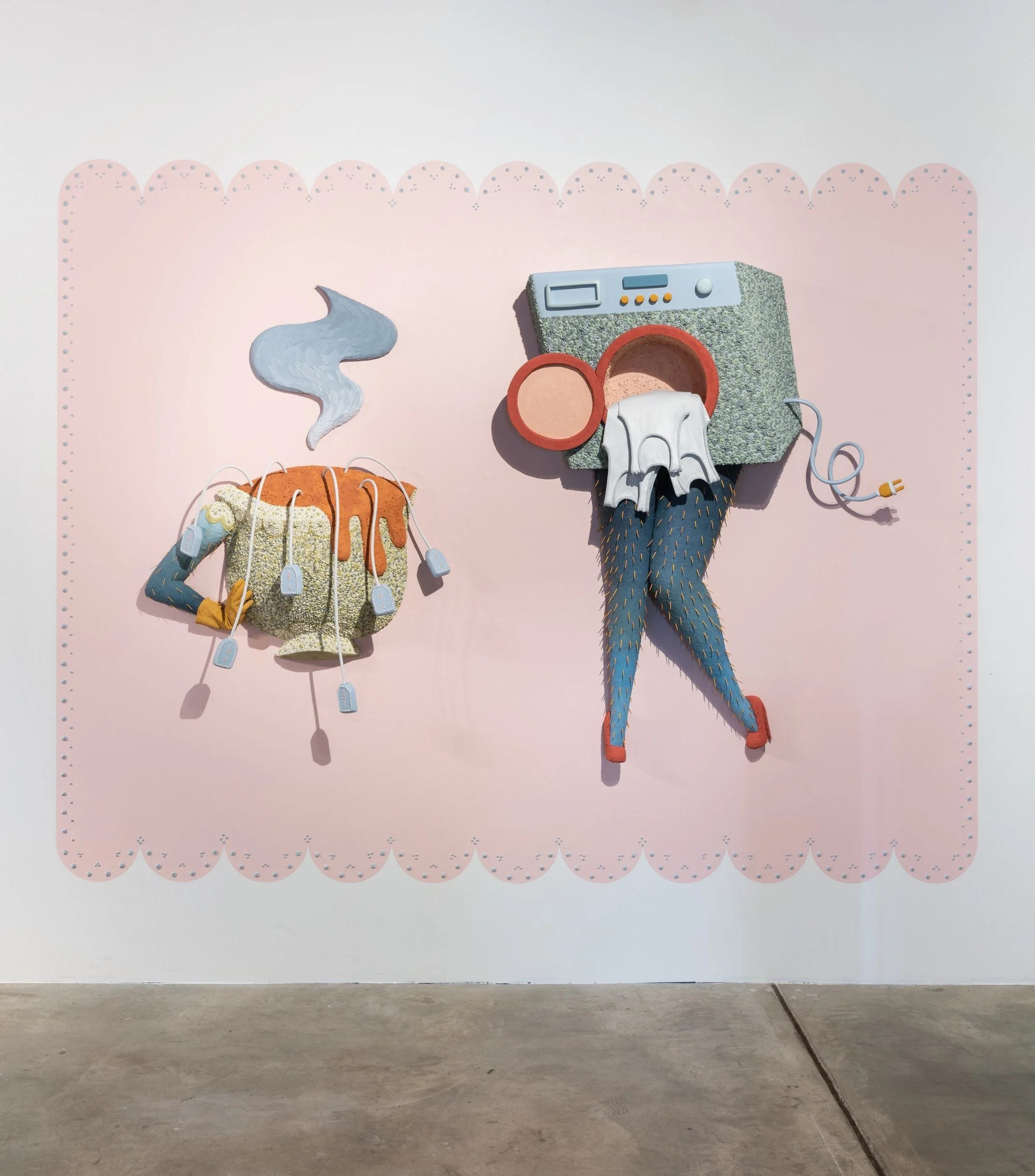 Wifebeater Washer Unplugged, 2019, Insulation foam, caulk, acrylic, vinyl tubing, wire, wife beaters, 165 x 137 x 40 cm